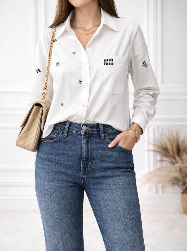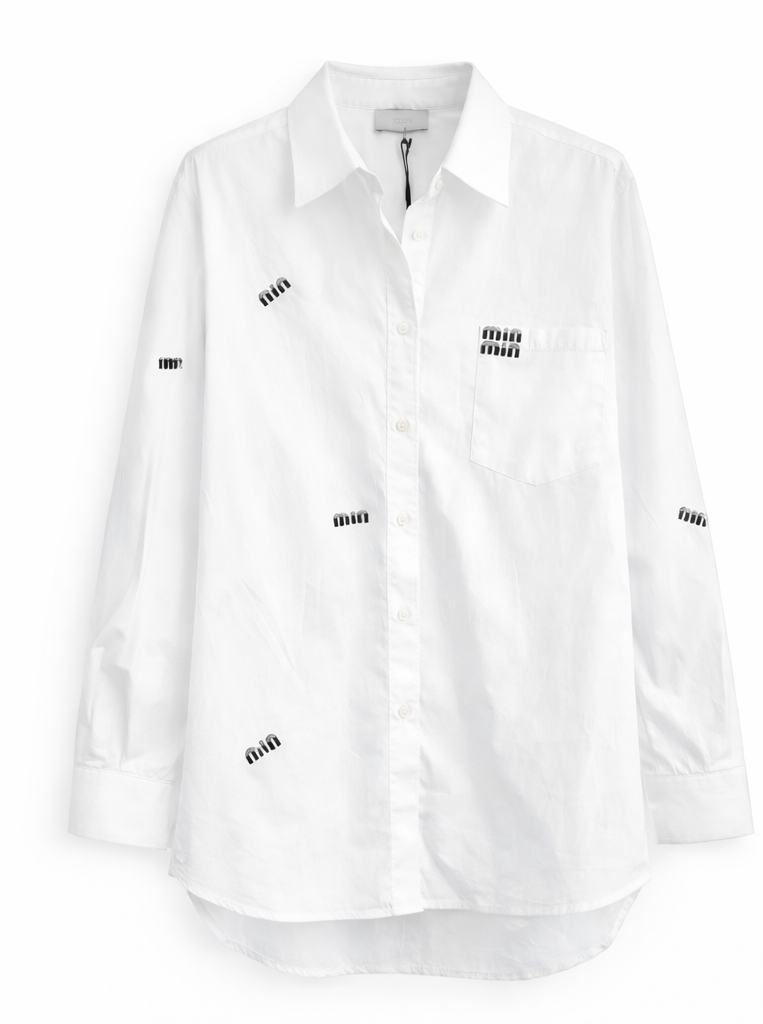 Elegantná dlhá košeľa s dlhým rukávom a zapínaním na gombíky v nadčasovej bielej farbe. Jemný kamienkový detail na línii vytvára decentný lesk a ženský šmrnc.