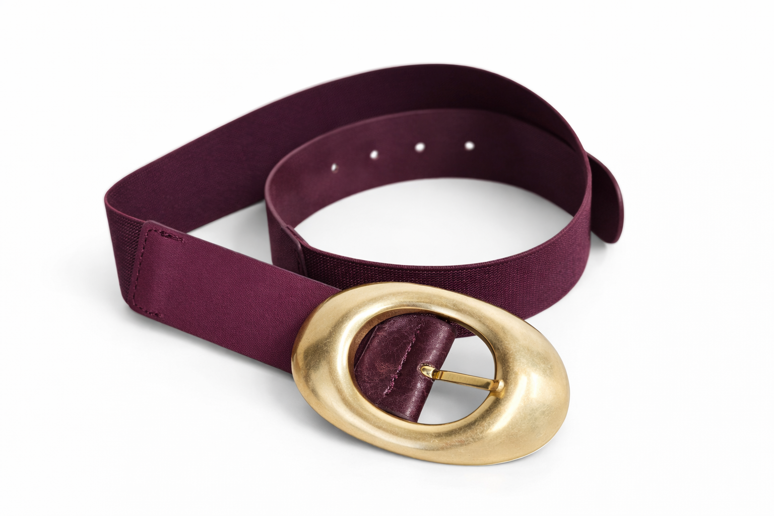 Bordový pružný opasok so zlatou sponou.