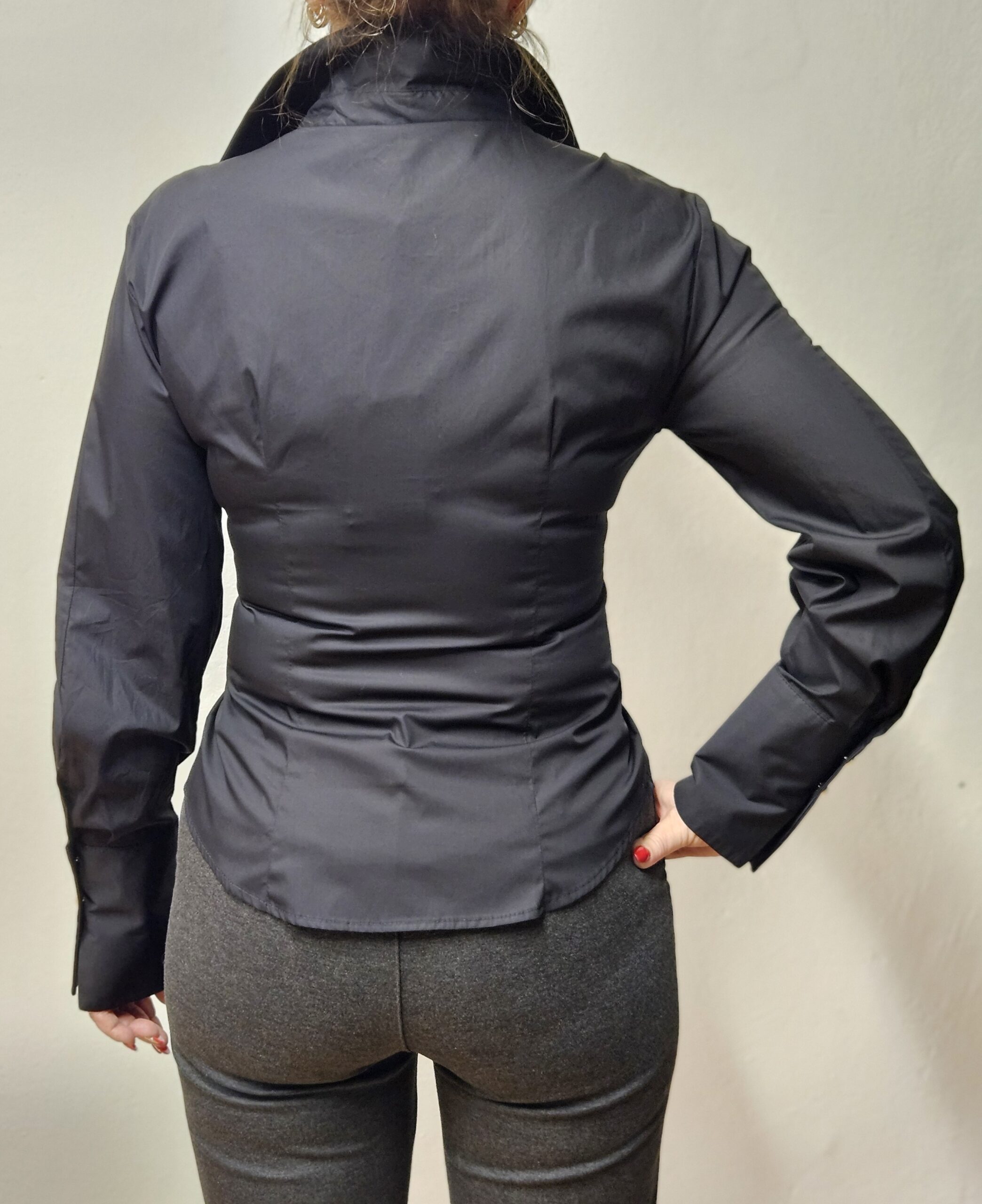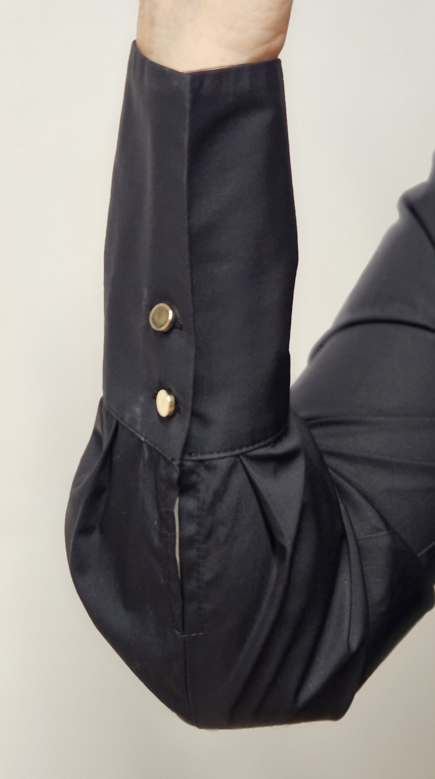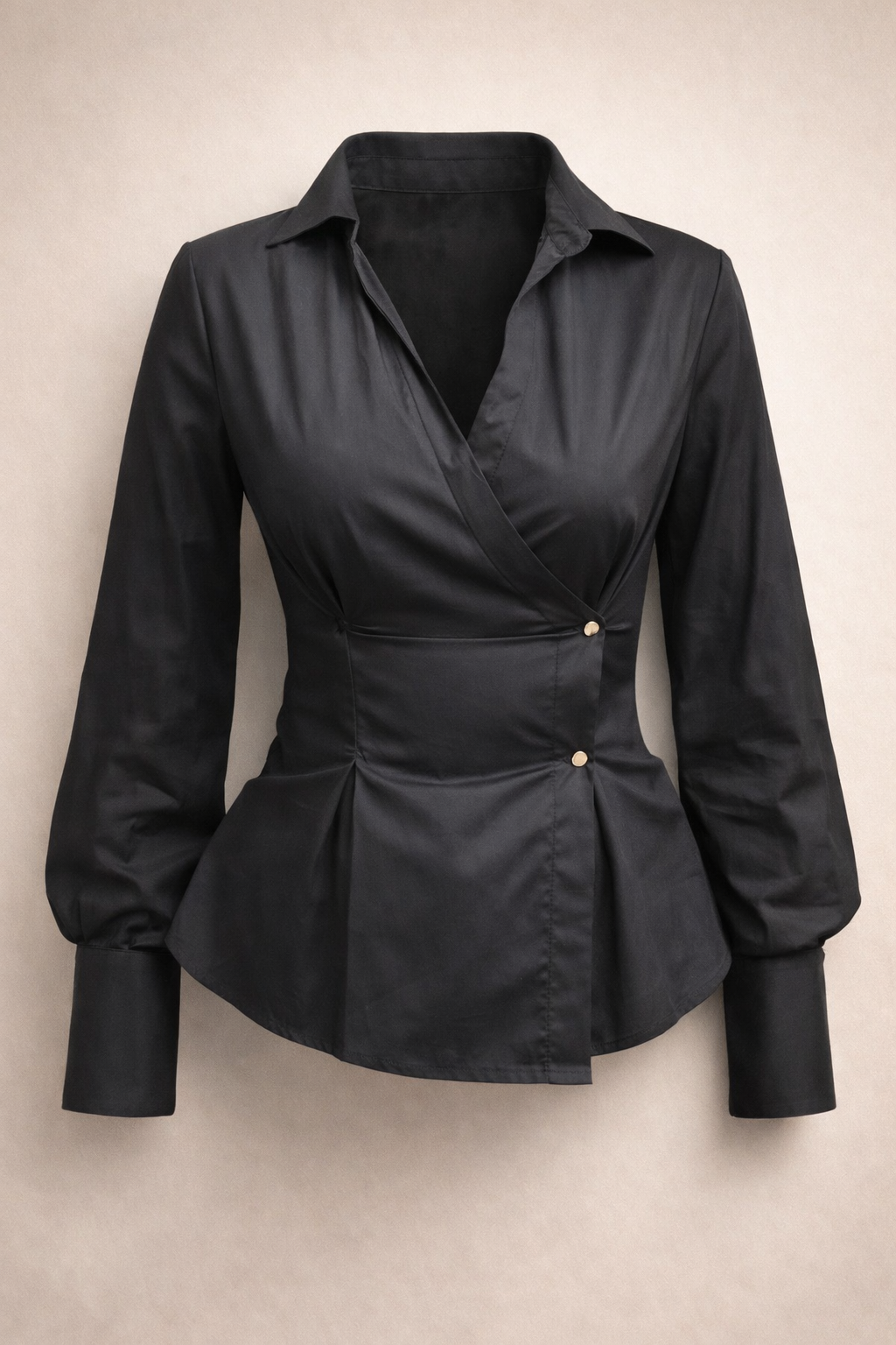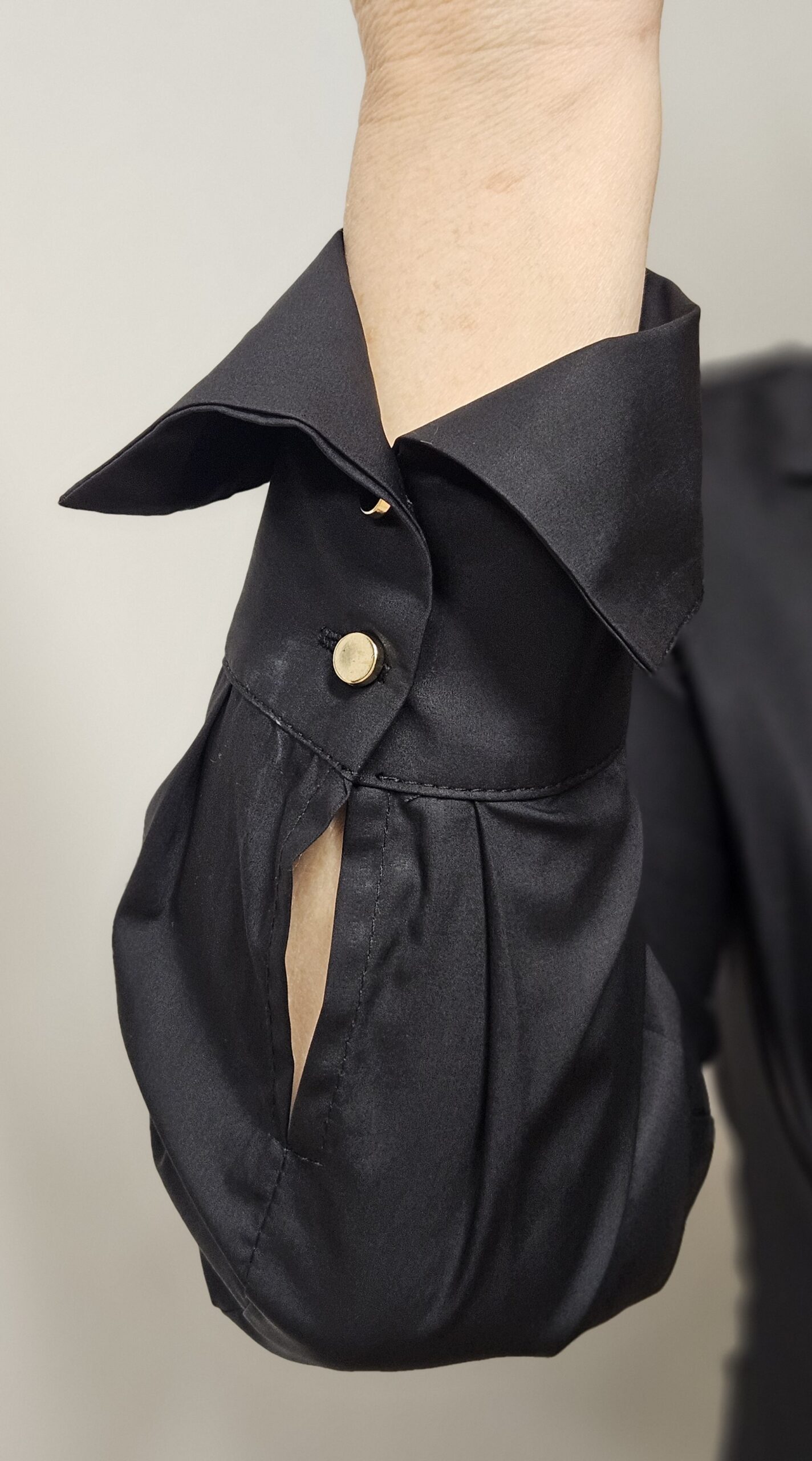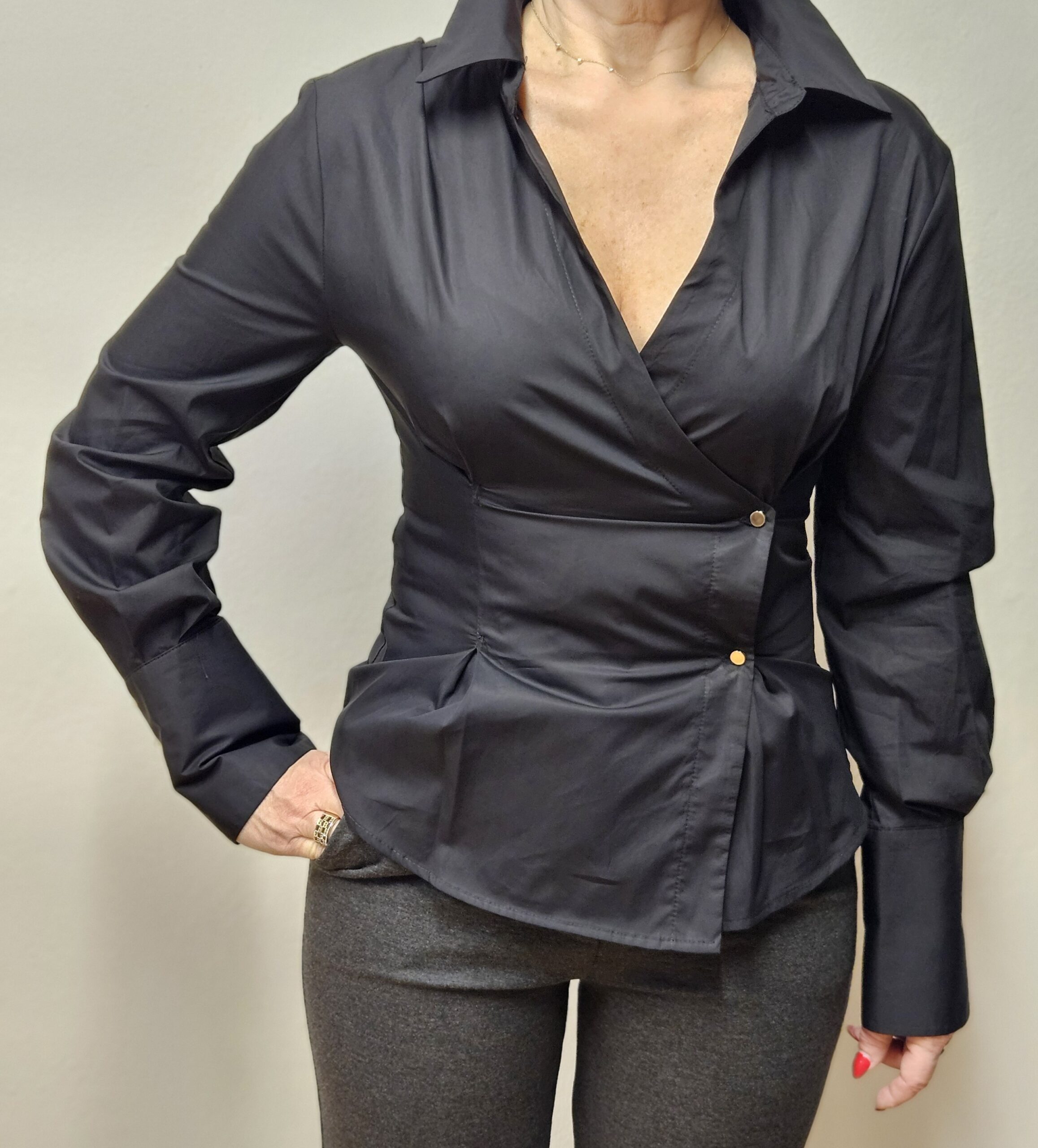Čierna bavlnená blúzka je nadčasový kúsok, ktorý v sebe spája eleganciu a pohodlie. Prekladané zapínanie vytvára jemný výstrih a opticky zoštíhľuje siluetu. Výrazné manžety dodávajú blúzke moderný a luxusný vzhľad. Vďaka strihu, ktorý prirodzene formuje pás, je blúzka ideálna k nohaviciam s vysokým pásom, sukniam aj elegantným džínsom. Príjemná bavlna zabezpečuje komfort počas celého dňa-do práce aj na večerné stretnutia.