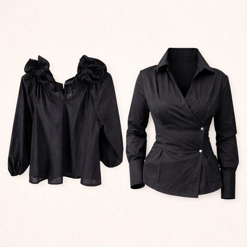 Čierna bavlnená blúzka v áčkovom strihu je ideálnou voľbou pre ženy, ktoré hľadajú pohodlie spojené s jemnou eleganciou. Malý výstrih je olemovaný dvojradovým volánom, ktorý dodáva blúzke ženskosť a ľahký romantický nádych. Voľnejší áčkový strih krásne splýva, neobopína postavu a lichotí rôznym typom siluety. Rukávy sú ukončené gumičkou, vďaka čomu sa pohodlne nosia a vytvárajú nadýchaný efekt. Blúzka je bez zapínania, jednoducho sa oblieka a je ideálna na každodenné nosenie aj na elegantnejšie príležitosti.
