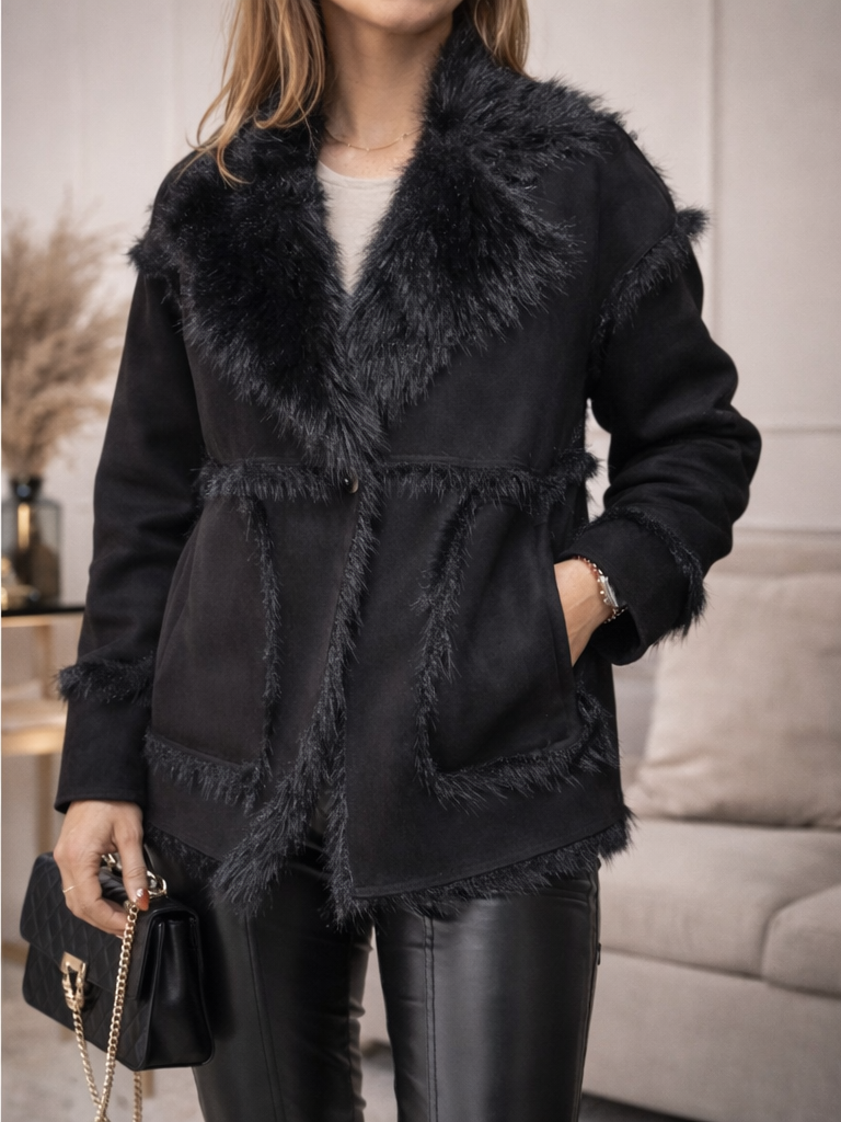 Luxusná kožušinová bunda v čiernom farbe, ktorá pôsobí elegantne. Vyrobená z kvalitnej umelej kožušiny s dvoma funkčným vreckami je efekte ušitá. Zapínanie na gombíky.