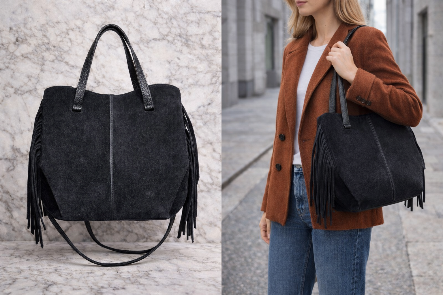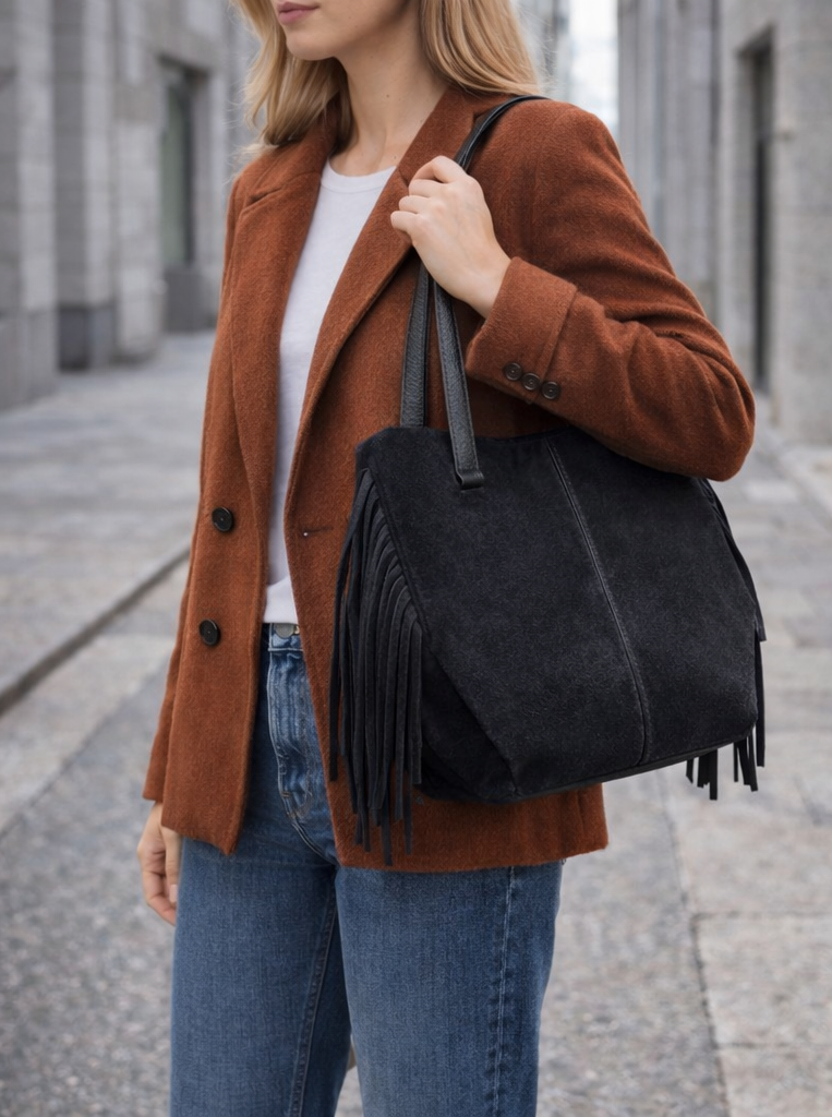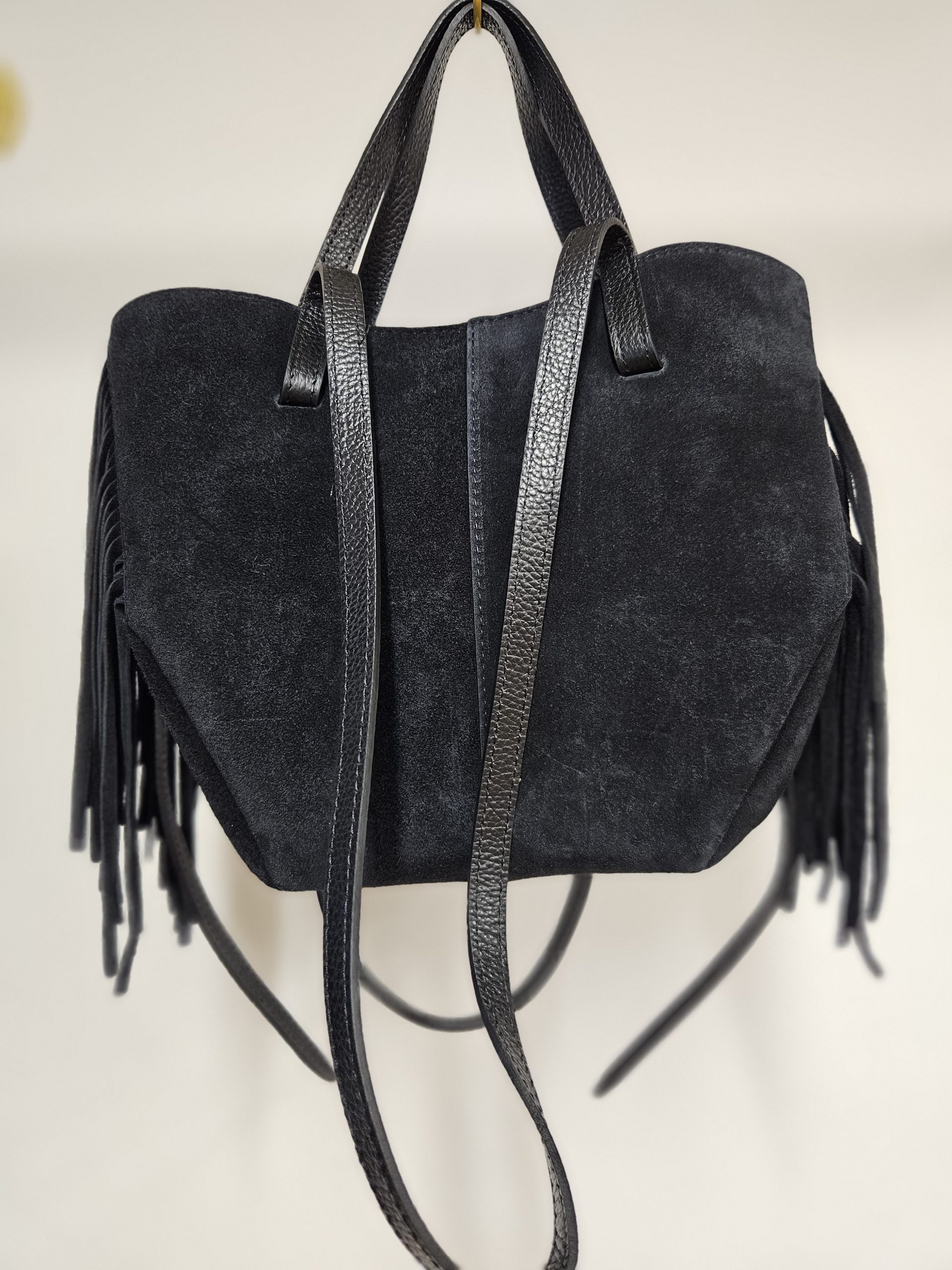 Štýlová bordová kabelka vyrobená z kvalitnej brúsenej /semišovej/ kože, ktorá pôsobí elegantne a žensky. Dizajn dopĺňajú strapce po bokoch, ktoré kabelke dodávajú moderný a originálny vzhľad.