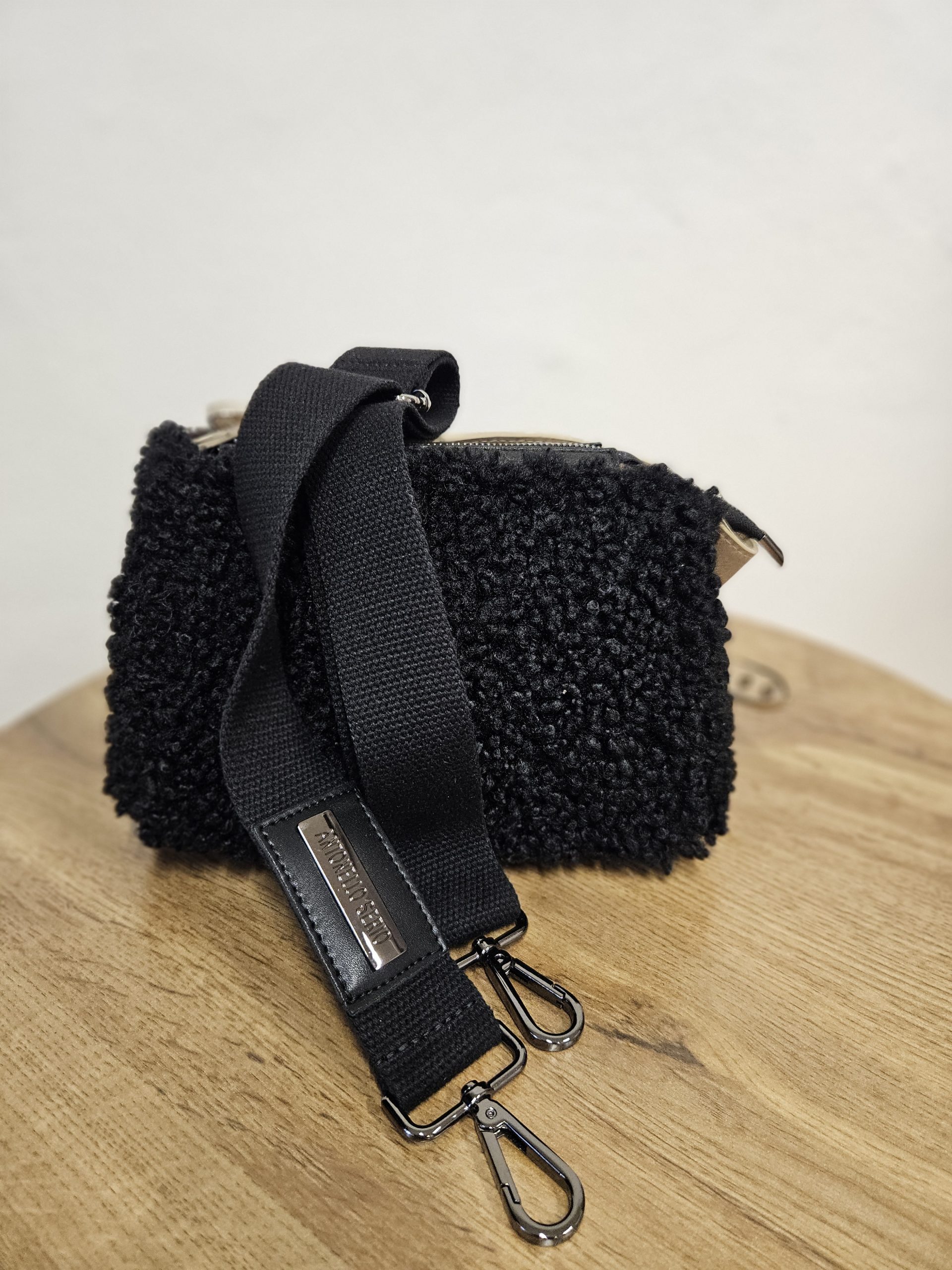 Originálna malá kabelka v čiernej farbe, ušitá z materiálu s efektom „barančeka“-mäkučká, nadýchaná a mimoriadne štýlová.