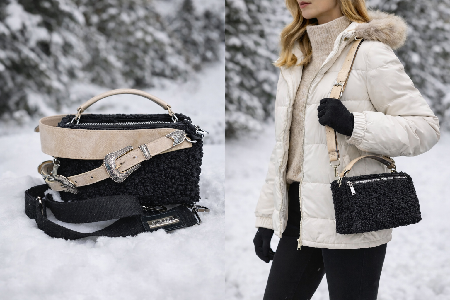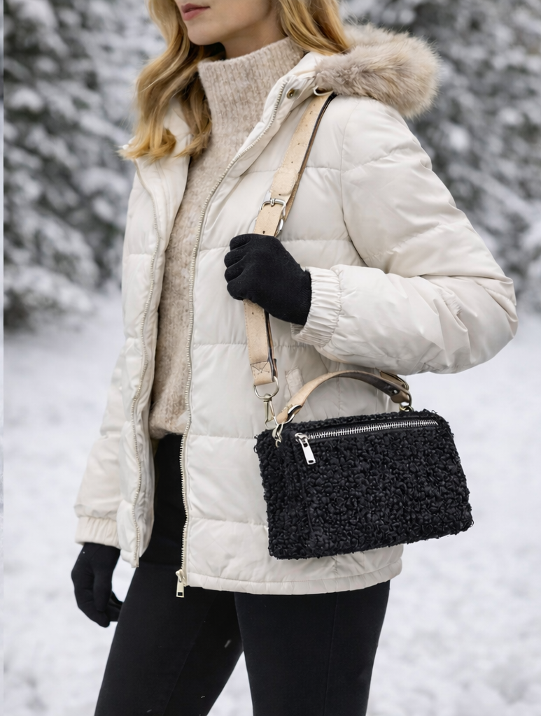 Povrch pripomína kožuch, čo jej dodáva moderný zimný look a jedinečný charakter. Kabelka má béžovú rúčku s kovaním, ktorá vytvára krásny kontrast a pôsobí luxusne. Súčasťou je aj dlhý nastaviteľný remienok, takže ju môžete nosiť pohodlne cez rameno, alebo crossbody.