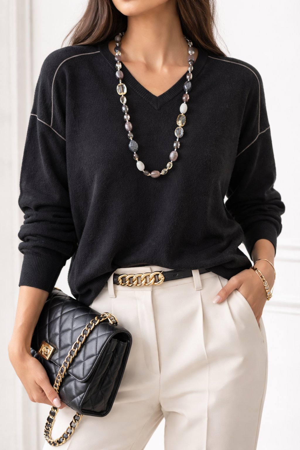 Luxusný čierny pulóver z jemnej zmesi vlny a kašmíru, zdobený decentnou striebornou retiazkou na ramenách a rukávoch. Mäkký, hrejivý a príjemný na dotyk. Elegantný kúsok, ktorý dodá outfitu sofistikovaný lesk.