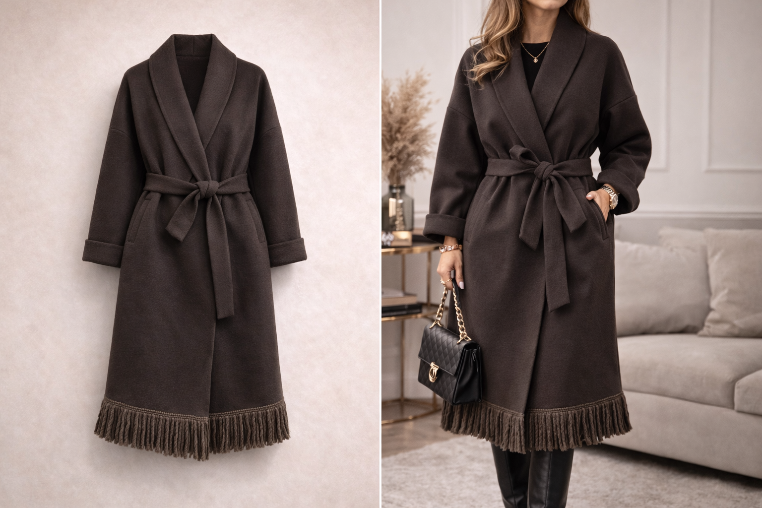 Elegantný a štýlový, dlhý kabát v tmavohnedej farbe s výrazným detailom v podobe strapcov na spodnom leme a dvoma funkčnými vreckami. Bez podšitia. Bez zapínania. Opasok zvýrazní pás a dodá ženskú siluetu. Ak sa chcete odlíšiť originálnym kúskom, siahnite po tomto kabáte.