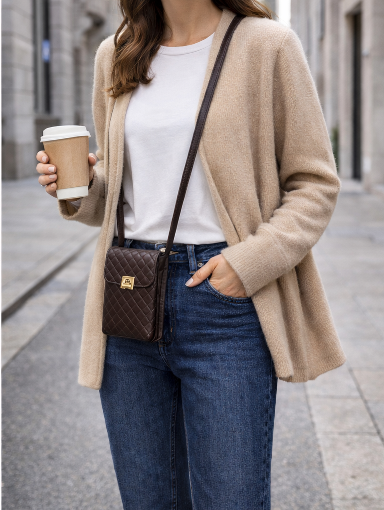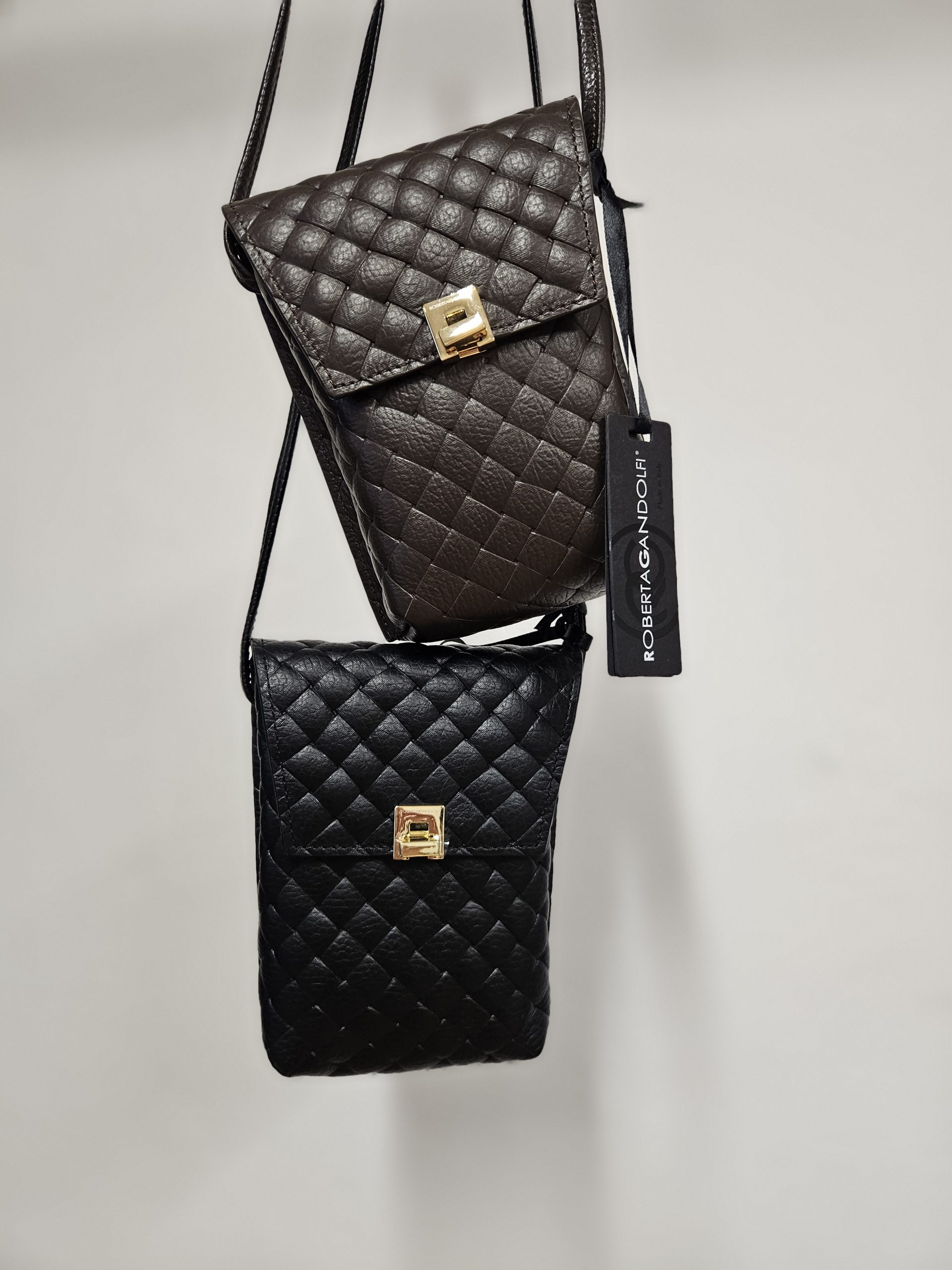 Luxusné kožené puzdro na mobil od talianskej značky Roberta Gandolfi zaujme svojim originálnym vzhľadom, jemná štruktúra kože vytvára efekt prešitia. Ide o mimoriadne štýlový kúsok, ktorý dodá každému outfitu eleganciu. Originálny dizajn. Potlač a textúra pôsobia exkluzívne. Sofistikované farby čierna a tmavohnedá, ktoré doladíte ku akémukoľvek oblečeniu. Ideálne na mobil, karty, menšie drobnosti či hotovosť-perfektný spoločník na rýchle vybavovanie aj večerné výjazdy. Možnosť nosenia crossbody aj cez plece. Zapínanie na zlatú pracku vpredu a zadným vreckom.