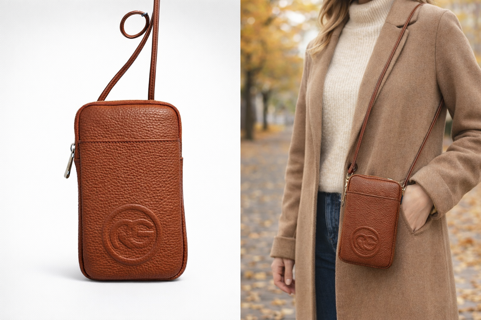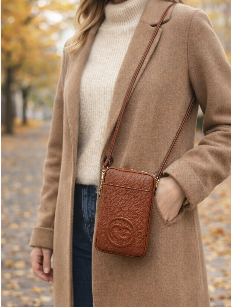 Elegantné kožené púzdro, ktoré slúži zároveň ako malá kabelka na mobil a iné drobnosti. Vyrobené z kvalitnej kože, dodá outfitu luxusný s štýlový vzhľad. Kompaktná veľkosť je ideálna na každodenné nosenie, pričom umožňuje mať všetko potrebné po ruke.