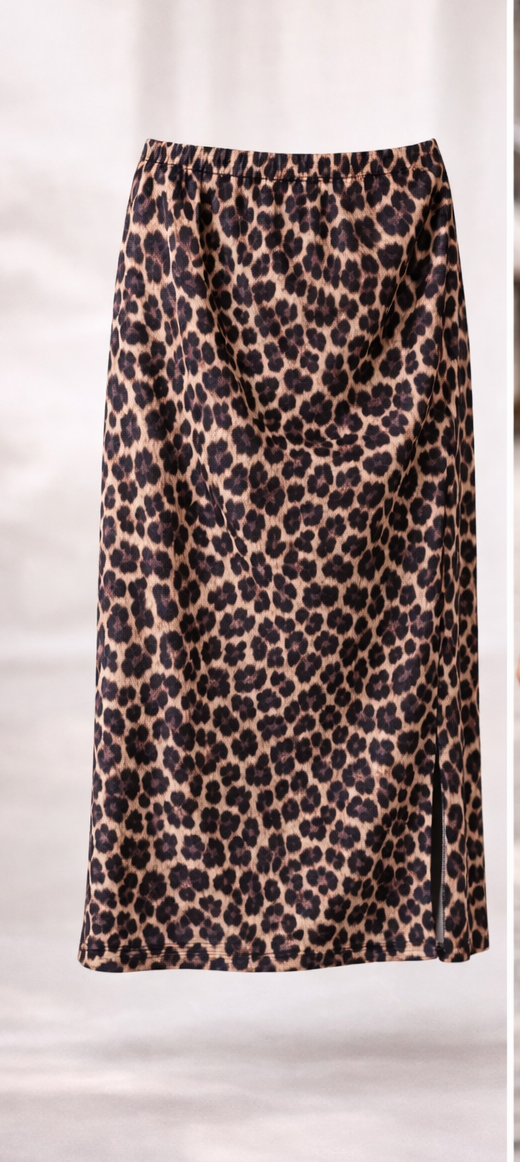 Štýlová midi sukňa s rázporkom a v páse s gumou, ktorý pridáva outfitu dynamiku. Leopardí vzor robí zo sukne výrazný kúsok, ktorý okamžite upúta pozornosť.