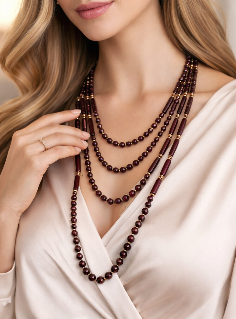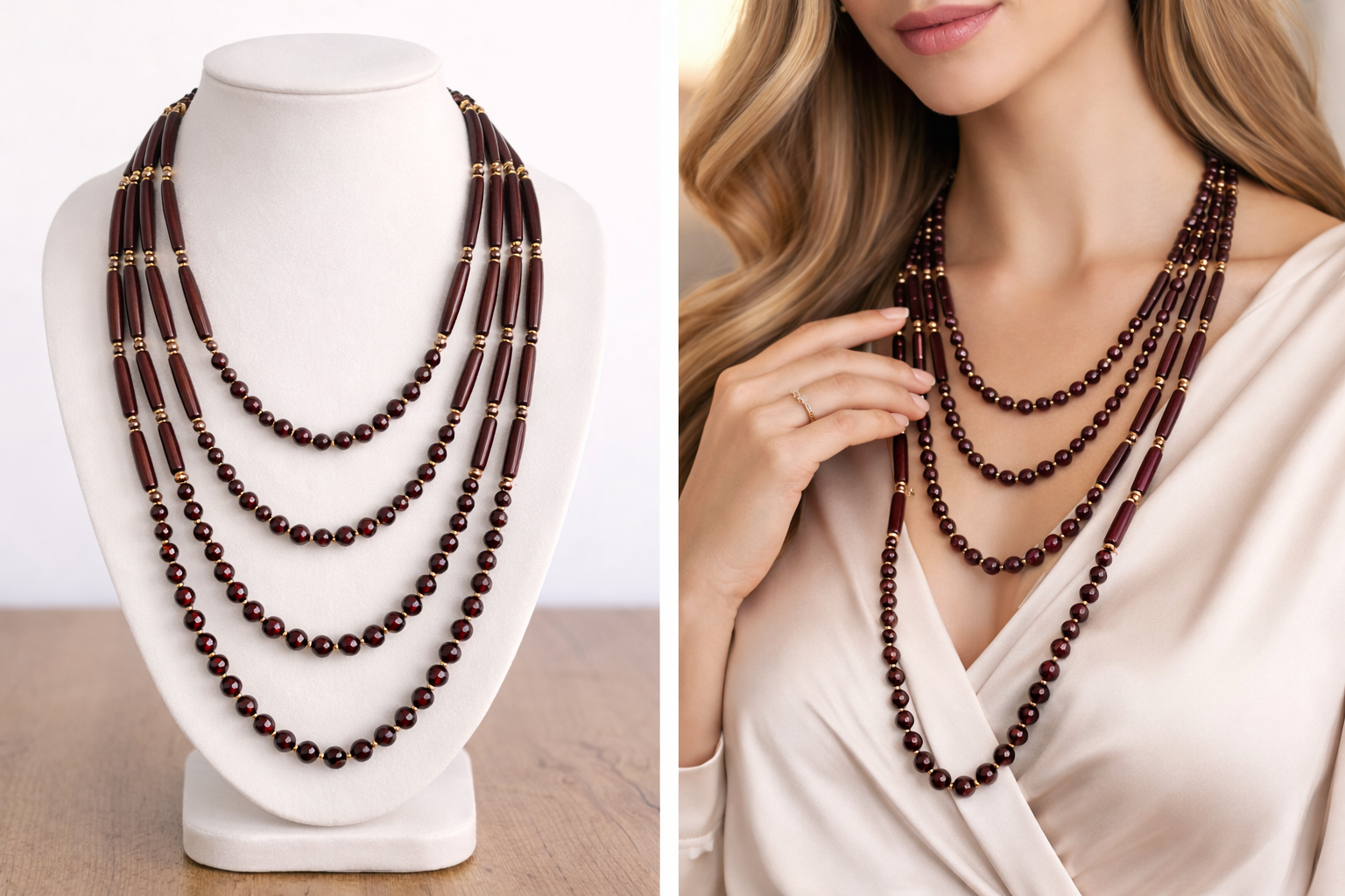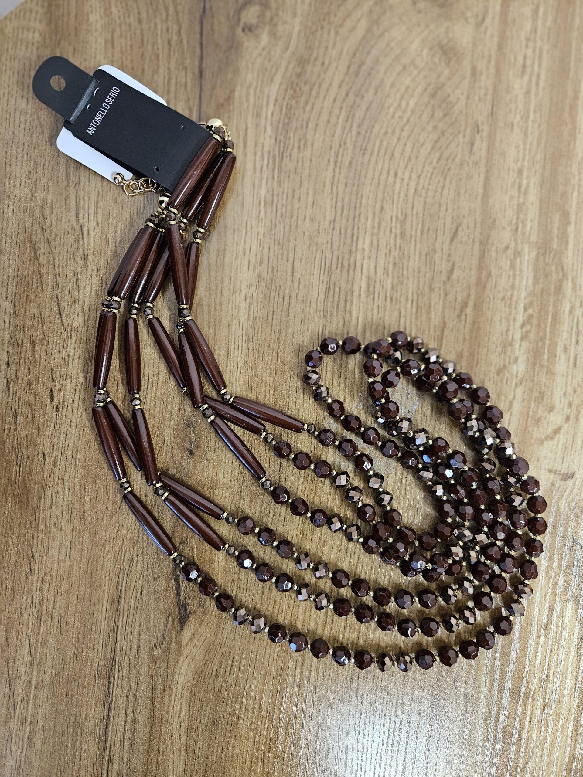 Originálny náhrdelník, ktorý okamžite upúta svojim teplým farebným ladením a elegantným zlatým odleskom. Kombinácia hnedých a bordových tónov pôsobí sofistikovane a ľahko sa kombinuje s jesennými aj zimnými outfitmi.