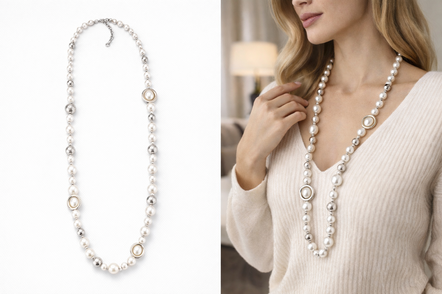 Elegantný náhrdelník s bielymi perlami, ktorý vnesie do vzhľadu klasický luxus a nadčasovosť.