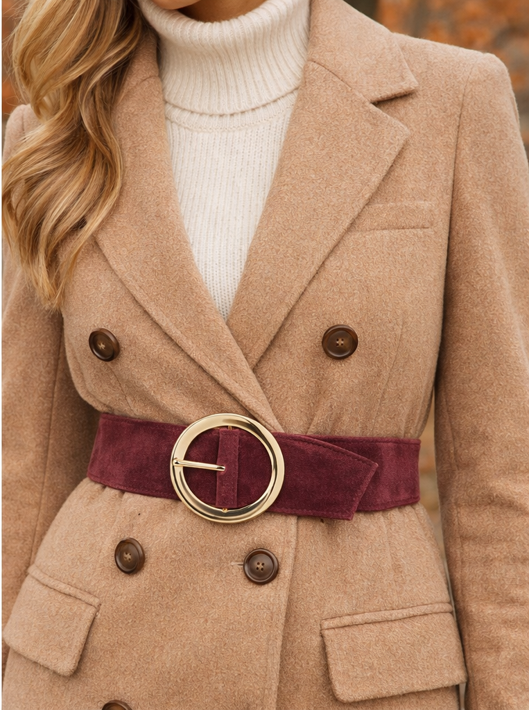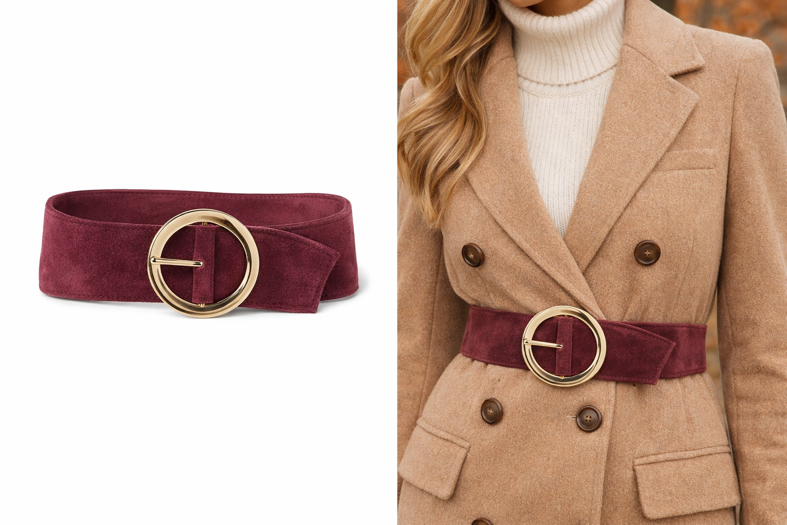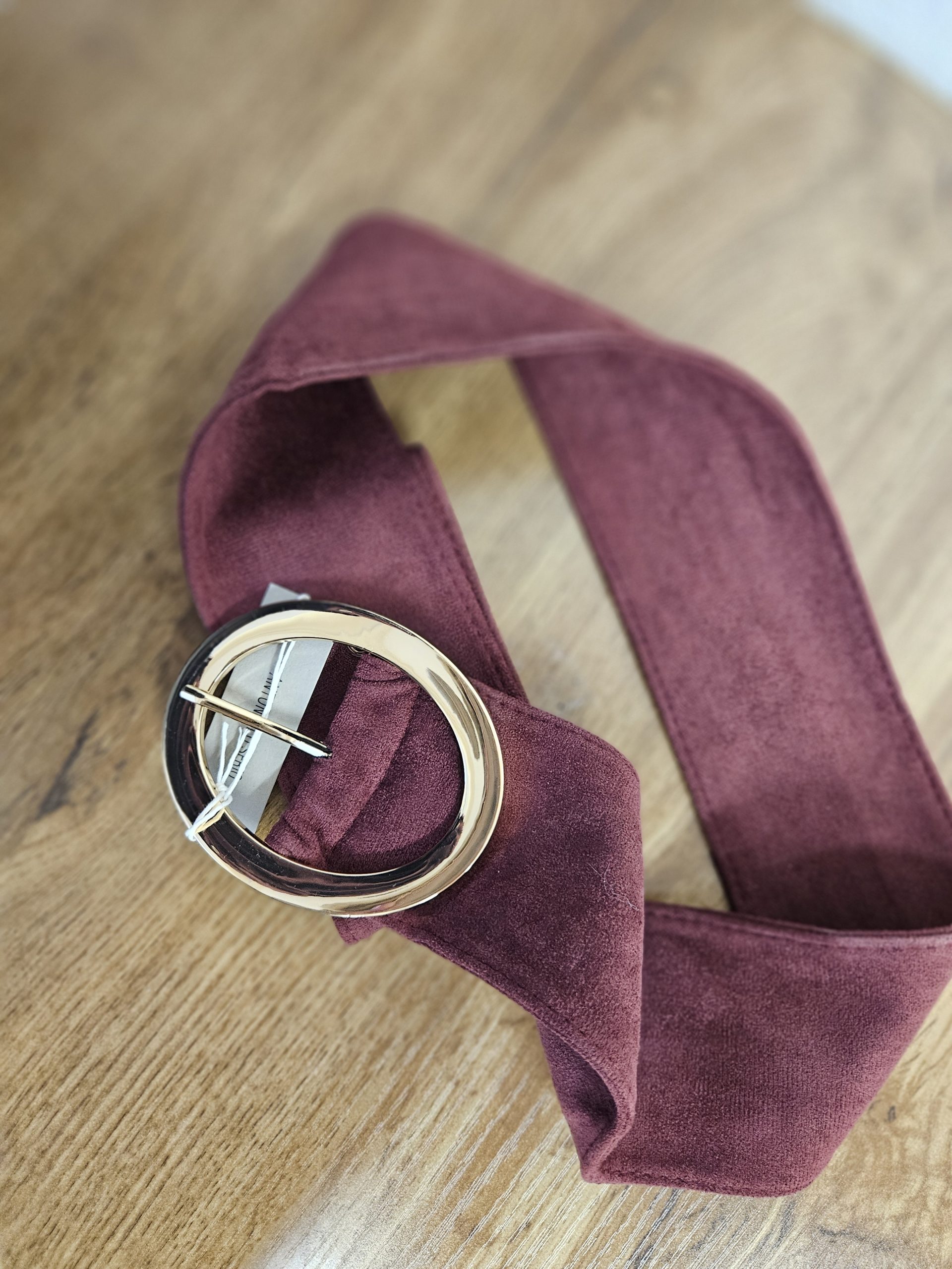 Štýlový látkový opasok, ktorý oživý každý outfit. Bordová farba pôsobí elegantne a zlatá spona dodáva celku luxusný akcent.