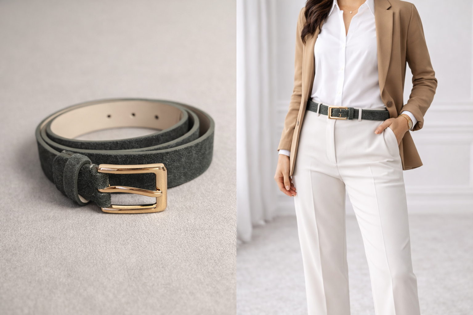Tento opasok z kvalitnej brúsenej kože je nadčasový doplnok, ktorý okamžite pozdvihne každý outfit. Jeho dominantným prvkom je pracka v štýle ikonickej módnej značky. Príjemný semišový povrch dodáva opasku jemnosť a prémiový vzhľad. Šírka je ideálna na bežné nohavice, sukne aj šaty. Hodí sa na každodenné nosenie aj špeciálne príležitosti-dodá outfitu luxusný akcent.